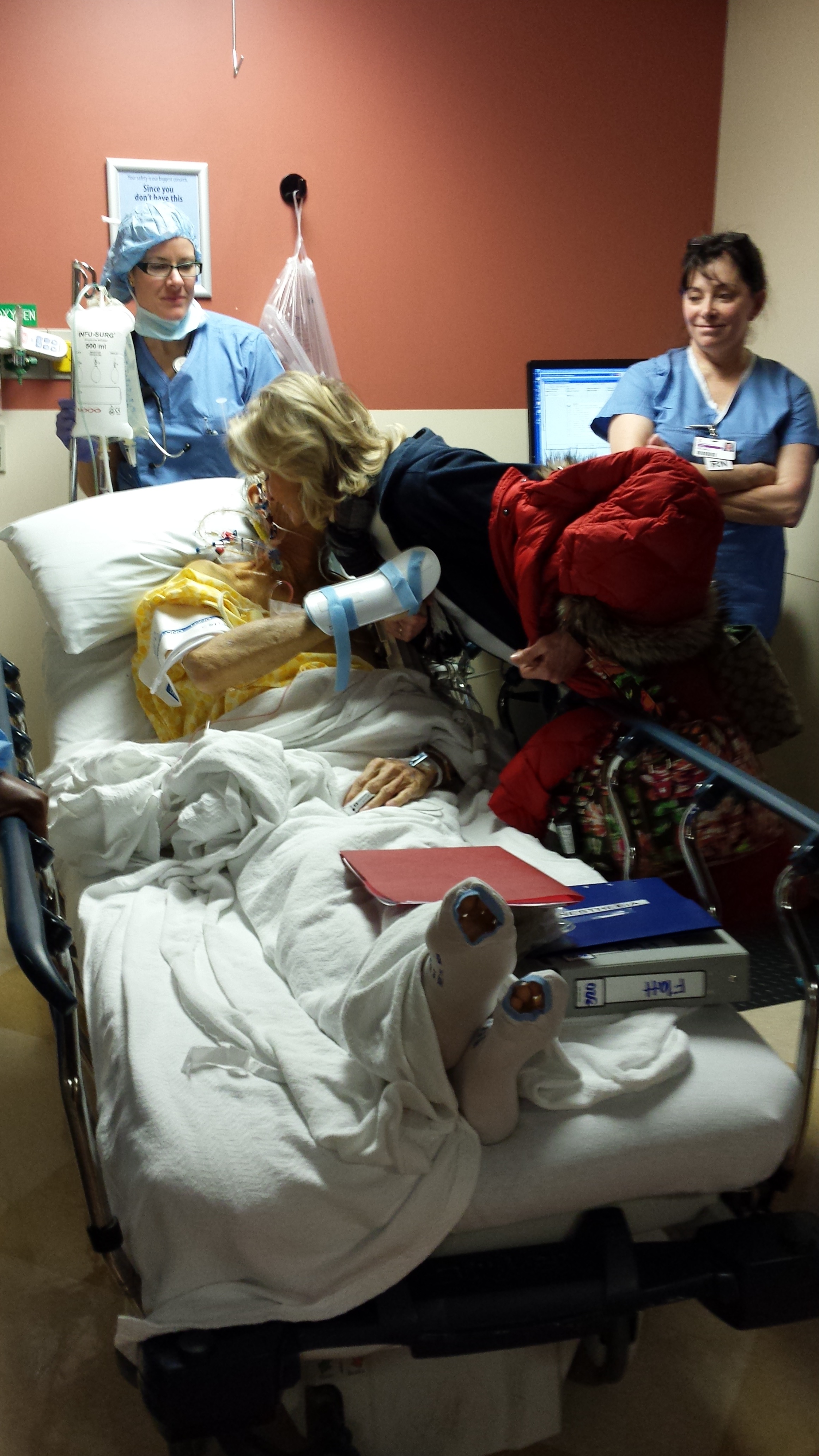 At 6am, we rolled into the hospital in sub-zero temperatures and began the waiting process prior to surgery. Not surprisingly, surgery was delayed until 9am, and after dad was taken to pre-op, we were sent to a freezing cold waiting room to hang out until we were called back to see dad before he went into surgery. The tension was thick.