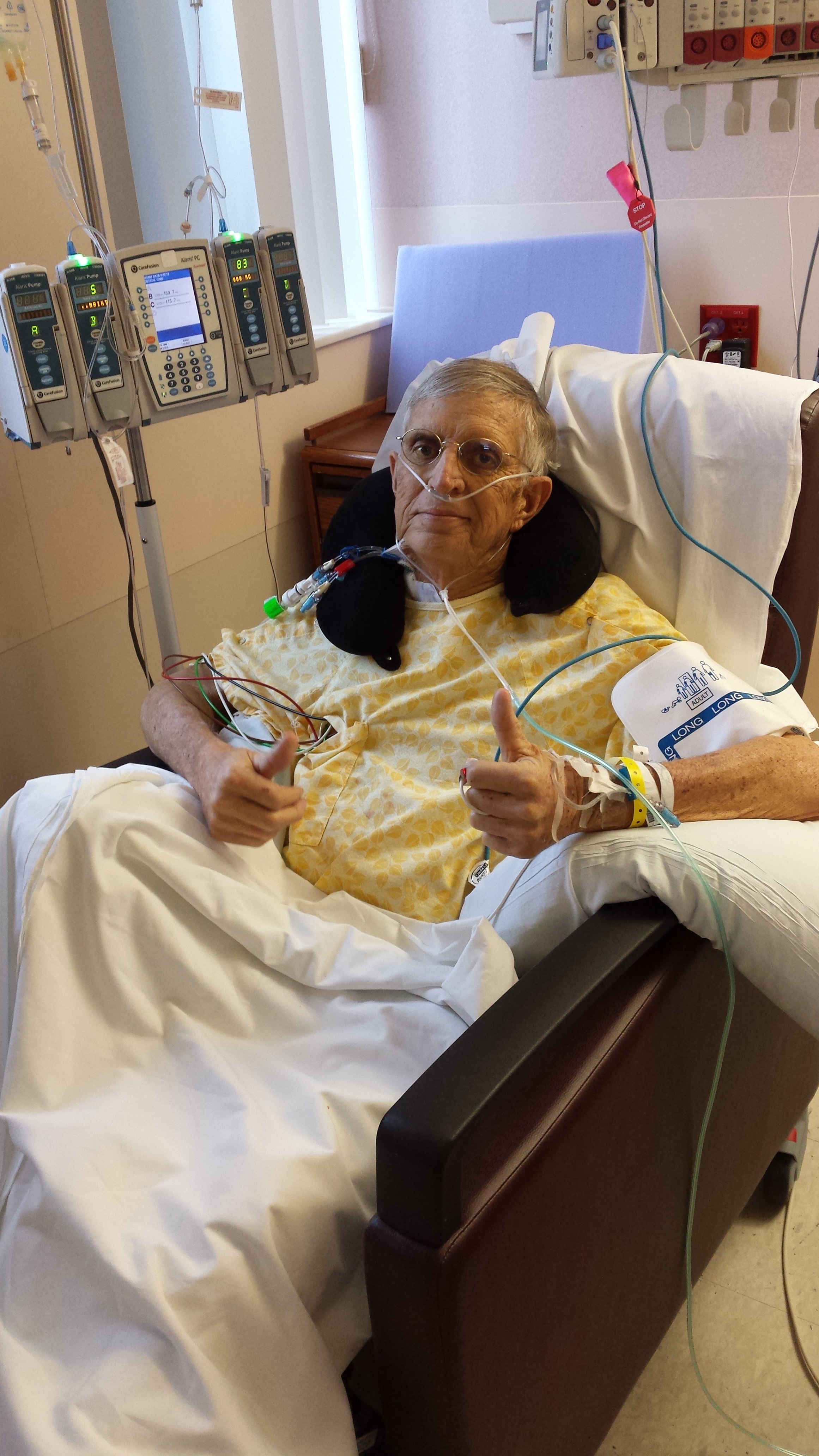 When we finally gathered ourselves, we headed up to the ICU waiting area where me, mom, Sonny and Lou would wait to go see him briefly. I was hesitant about this, but after the exhilaration of what had just happened, I was prepared and I wanted to see my daddy, the miracle man. Mom and Sonny went back first and came back smiling, so I wasn’t surprised when Lou and I went back to see that he looked fantastic. We all breathed a sigh of relief, even though what had just happened really hadn’t “sunk in” yet.