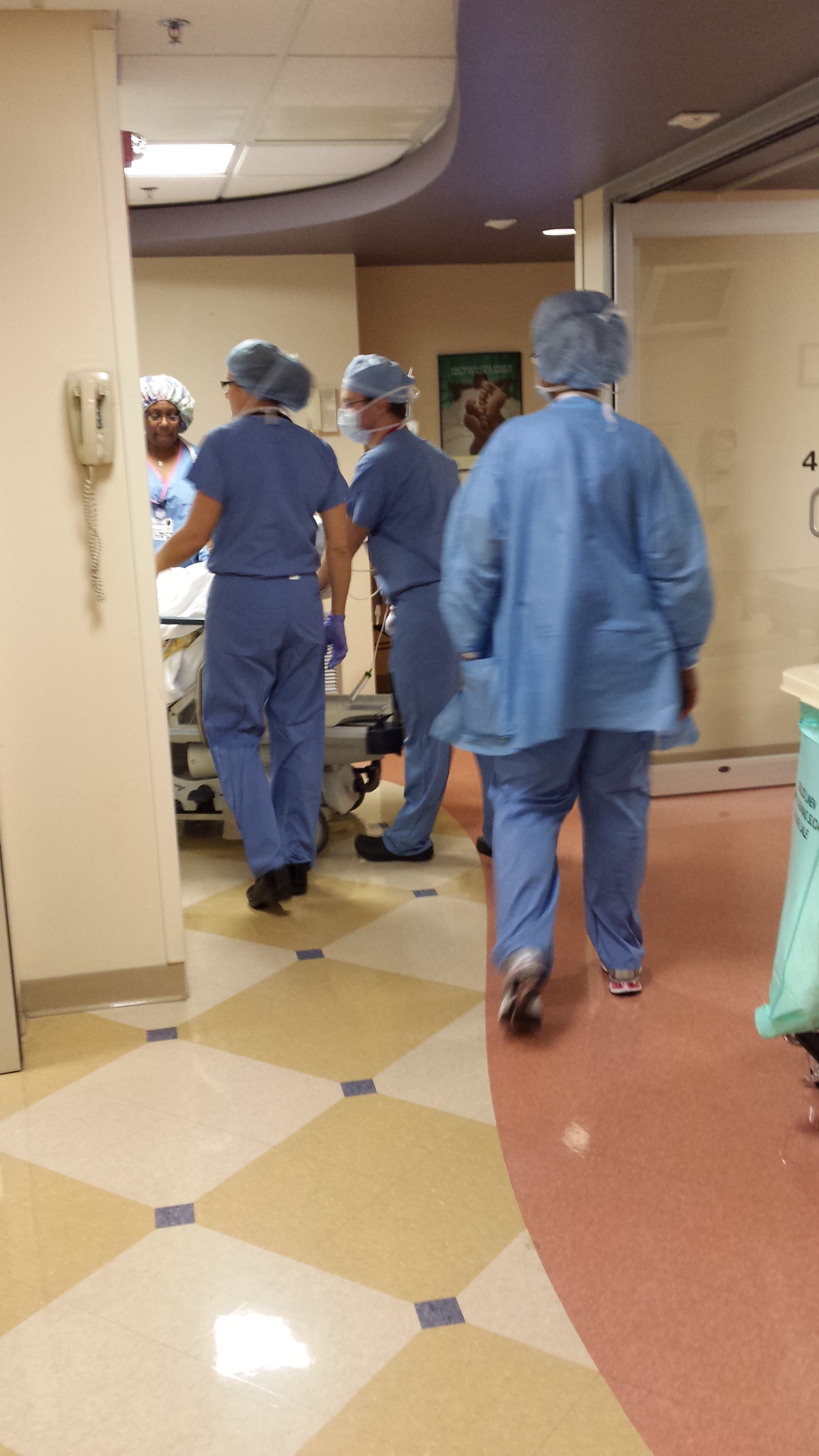 Things picked up rather quickly and the next thing I know, I’m signing paperwork, talking with the anesthesiologist, and being prepped for surgery. It was all a blur, really. They got Michael garbed up for the operating room and before I knew it, I was being wheeled in.